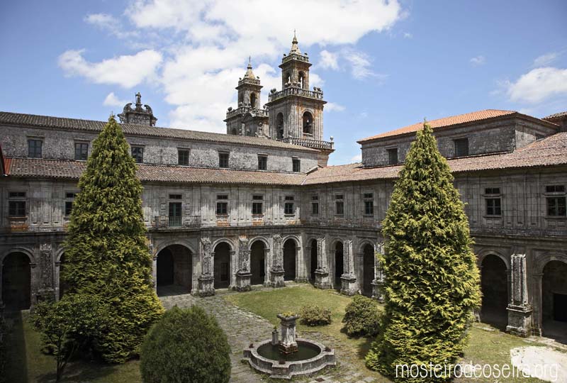 Inicialmente existió aquí un claustro medieval y luego otro del siglo XVI, del que proceden los medallones que se aprovecharon como decoración del actual que se comienza hacia 1760 y se hace en el estilo barroco de placas compostelanas que estaban entonces de moda.